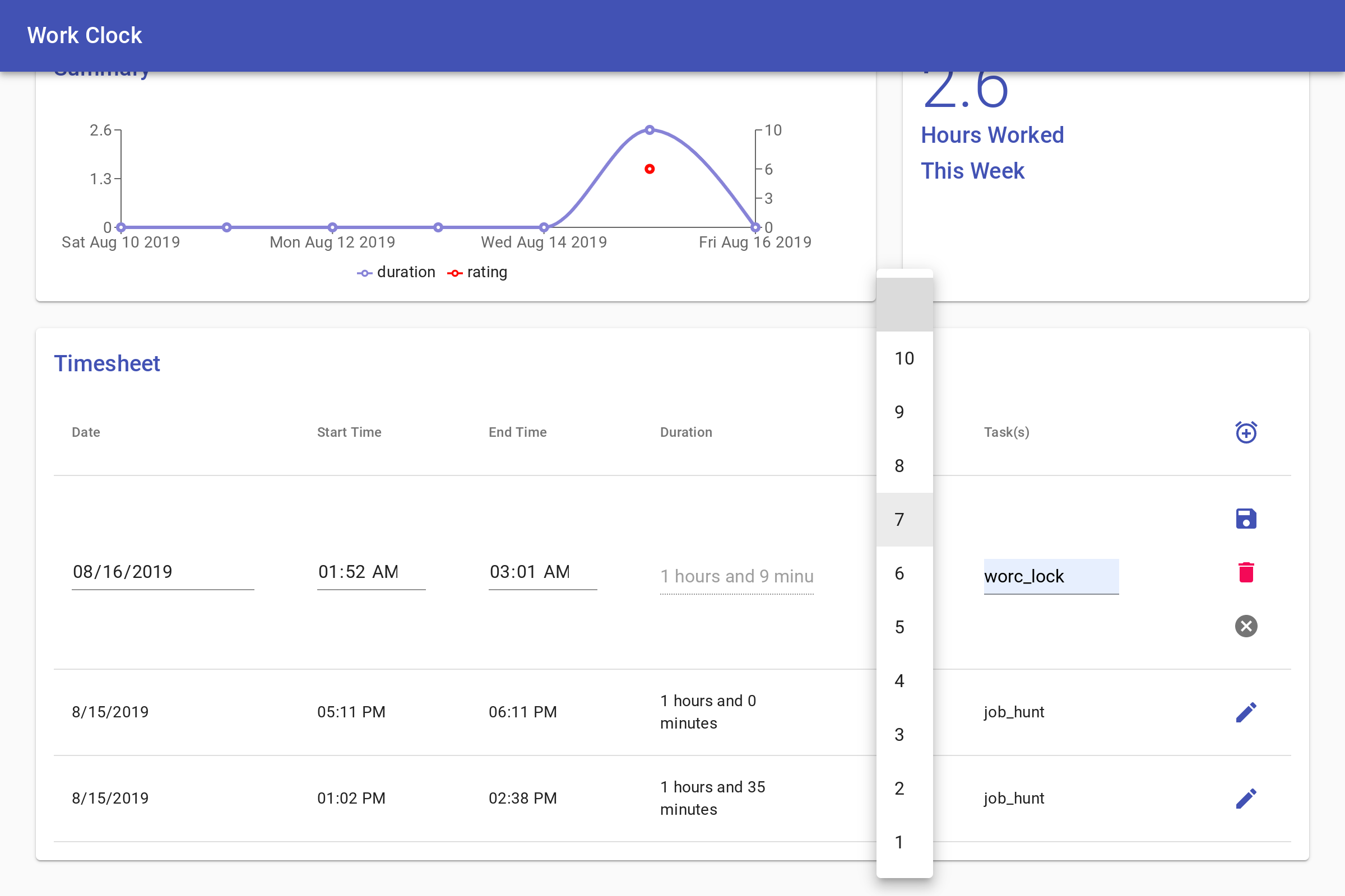 A personal virtual work clock that allows the user to ‘clock in’ and ‘clock out’ of their own productivity hours. The local server logs and stores each work period entry into a SQLite database. The user interface displays a stopwatch for starting and stopping work, a timesheet table of working entries, a summary time series chart and the amount of hours worked this week.